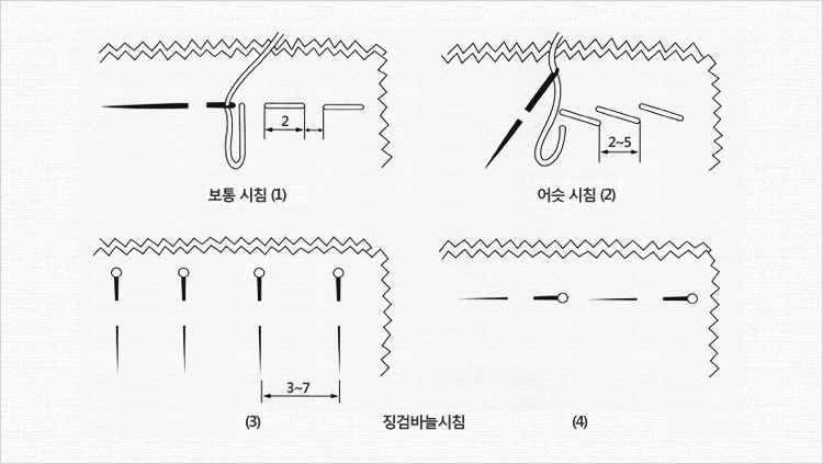 그림(1)은 보통 시침하는 방법이고 (2)는 두꺼운 옷감일 때 하는 어슷시침이다. 그림 (3), (4)은 핀으로 징그는 방법으로 특수한 옷감 외에는 이 방법으로 하는 것이 빠르고 실도 절약되어 편리하다. 보자기 등을 만들 때는 반드시 시침질을