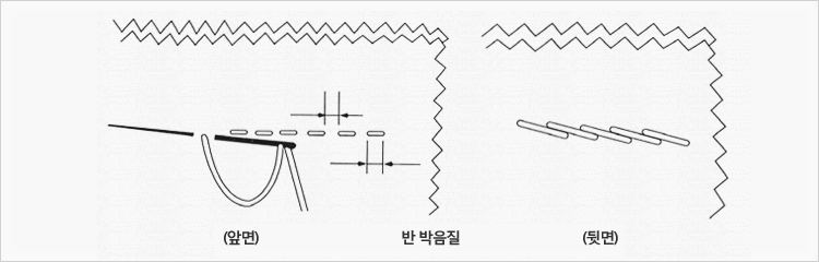 반박음질은 겉에서 보기에는 홈질을 한 것같이 보이나, 홈질보다는 튼튼하고 온 박음질보다는 약하다. 한 땀을 뜨고 난 다음 그 바늘땀의 반을 되돌아가서 다시 뜬다.