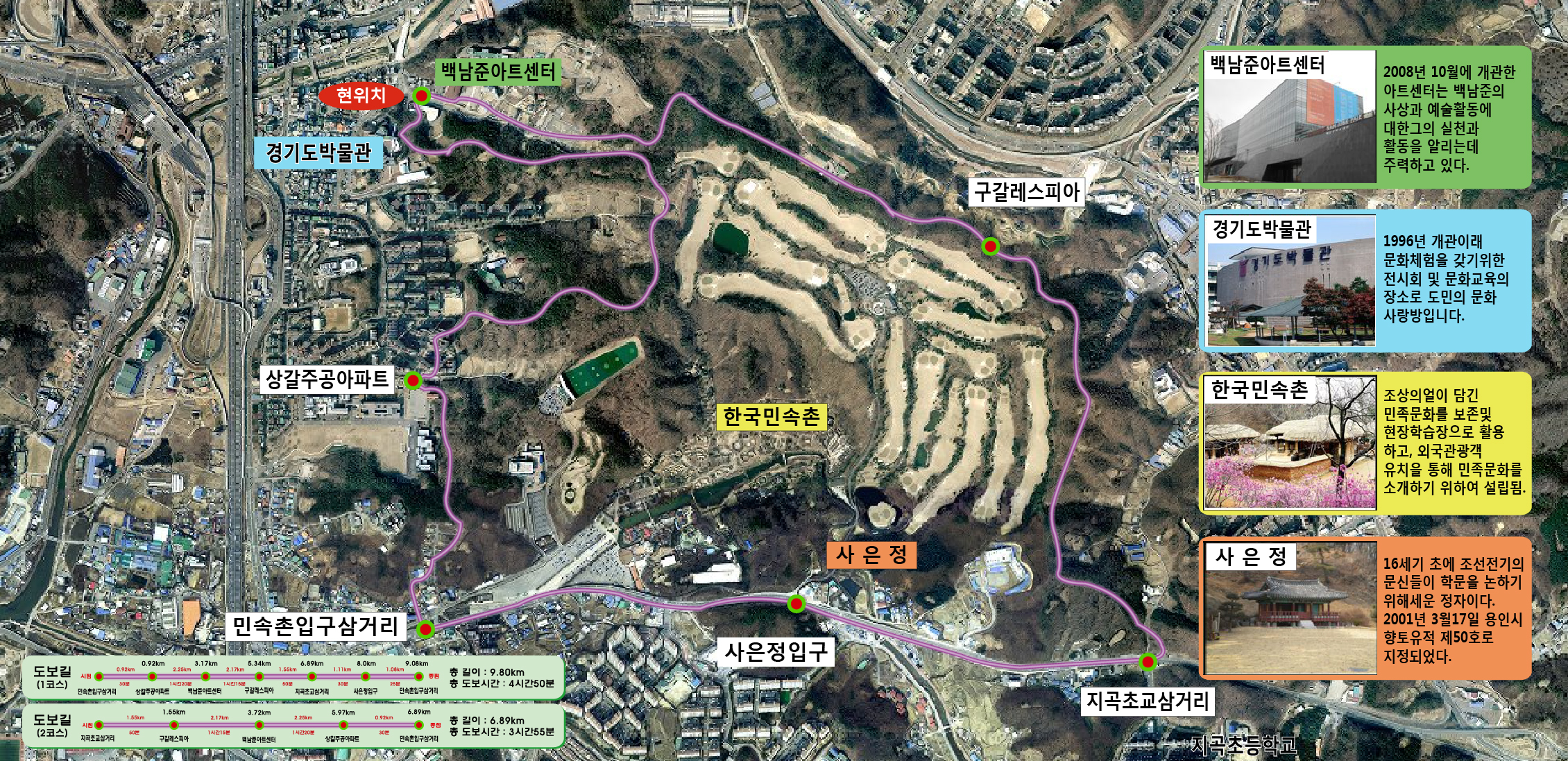 | 2코스 | 지곡초교삼거리(0) → 구갈레스피아(1.55㎞, 50분) → 백남준아트센터(2.17㎞, 1시간15분) → 상갈주공아파트(2.25㎞, 1시간20분) → 민속촌입구삼거리(0.92㎞, 30분) | 6.89km (3시간 55분) | ||