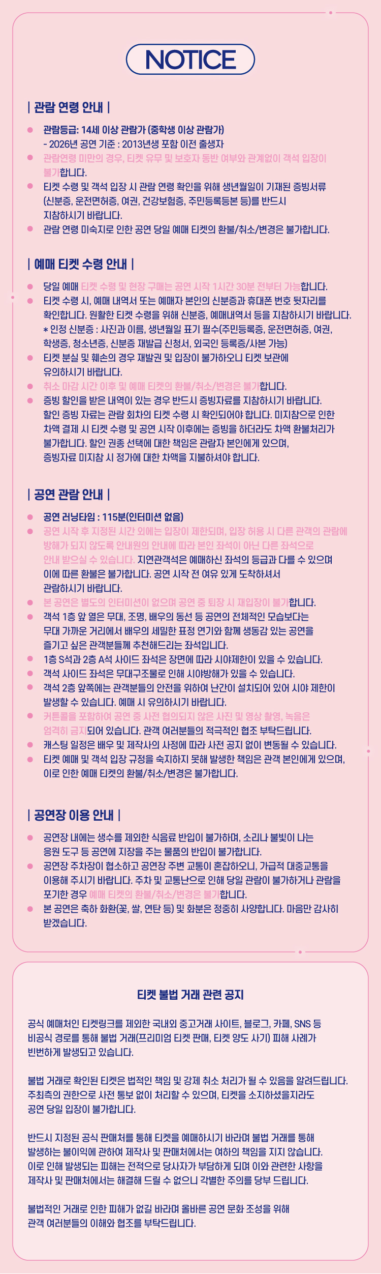 ※ 추가 오픈 된 OP석을 예매처(티켓링크,네이버) 통해 재예매하신 경우에 한해, 예매처(1588-7890) 문의 시 기존 예매 건은 수수료 없이 취소 가능합니다..