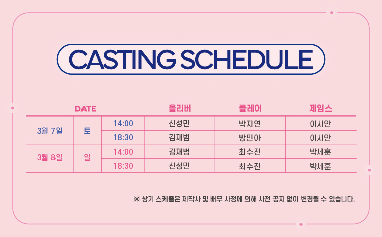 배우의 동선과 연기 장면(앉을 경우 등)에 따라, 일부 장면에서 시야 제한이 발생할 수 있어 S석으로 오픈됩니다. 이 점 충분히 검토하신 후 예매하시기 바랍니다.