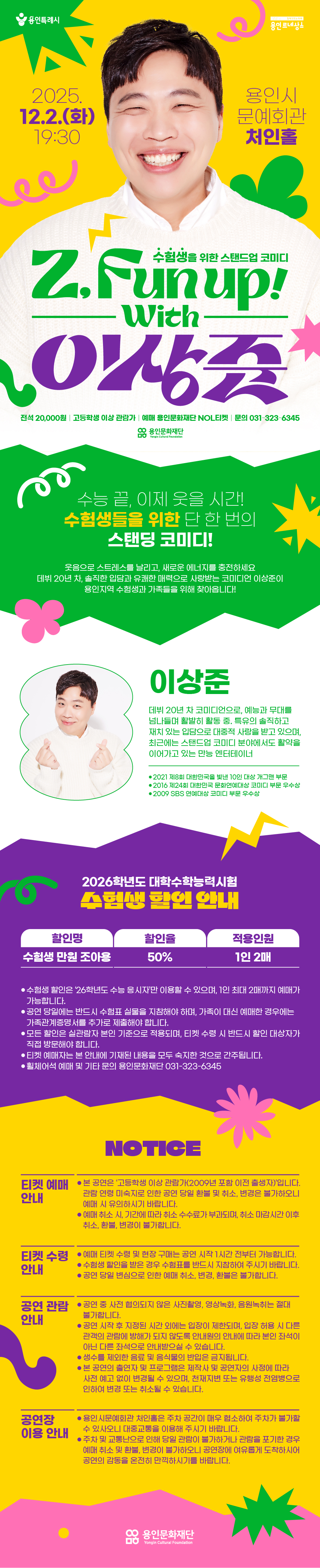 ▶ 공연 당일에는 수험표 실물을 반드시 지참해야 하며, 가족이 대신 예매한 경우 ‘가족관계증명서’를 함께 제출해야 합니다.
